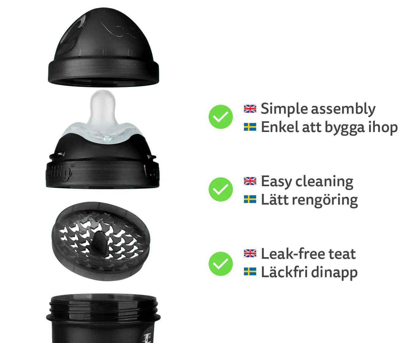 All our baby bottles come with a teat:140 ml/5 floz size S, 240 ml/8.5 floz size M och 340 ml/12 floz size L. You can also purchase Herobility teats in 5 different sizes right here on Herobility.com, ranging from XS to XL. XS is slightly smaller in size and is most suitable for smaller babies. The remaining sizes, S through XL, are the same size, but feature different amount of flow, which you can choose based on what’s best for your baby.