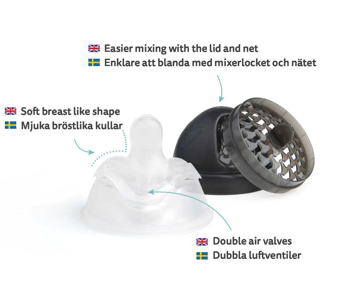 With traditional baby bottles, it’s not uncommon for the nipple to get clogged up from lumps in the formula. In our bottle, the mixer lid and net break up the lumps.
