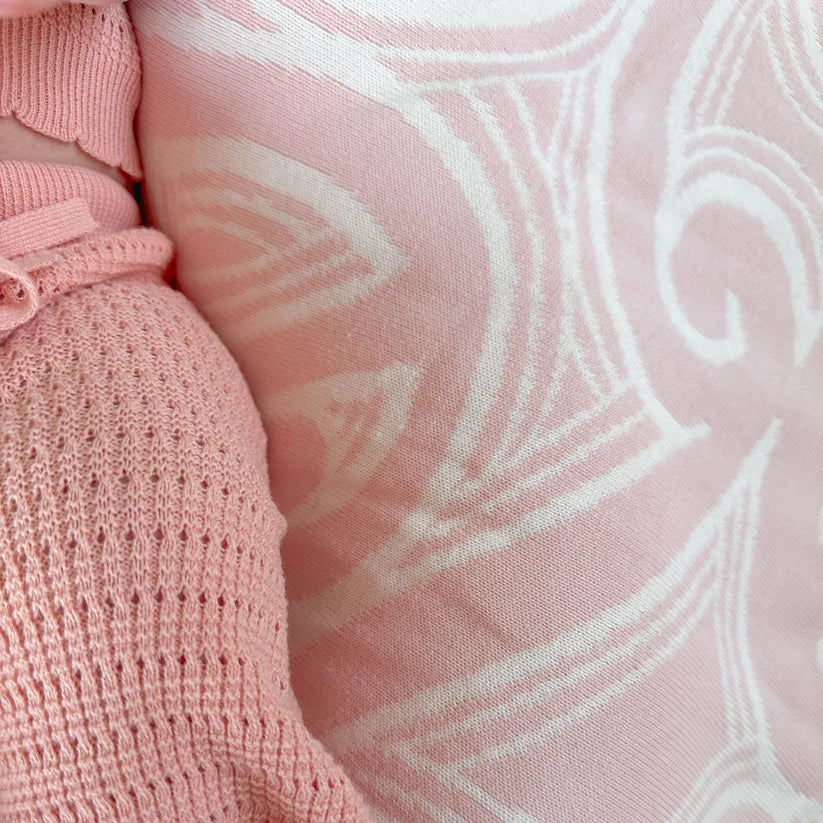 Luxurious knitted organic cotton pēpi blankets covered in symbols of Aotearoa. Our pēpi blankets are designed to be a heirloom / taonga to be treasured and passed down generations. Use to wrap your babes in the newborn stage, as a cot blanket, stroller blanket or simply as your baby's cuddly blanket.
