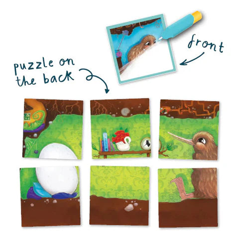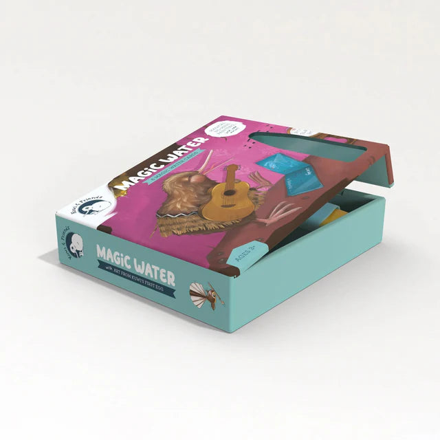 Designed for budding creatives, this compact activity set is bursting with fun. Simply fill the magic brush with water and watch as it unveils hidden pictures featuring scenes from the Kuwi the Kiwi books on the illustration boards. They can also engage in counting and 'i spy' activities on the back of each card. Once dry, the scenes disappear, allowing for endless painting fun!