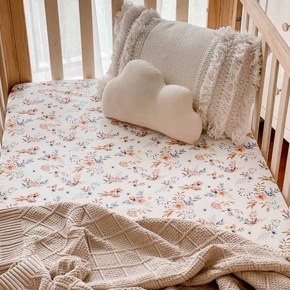 With whimsical vintage florals with cool hues the Maisie Fitted Cot sheet is made using 100% organic cotton for breathability and comfort. With soft boho hues inspired by nature, the floral fitted cot sheet is at home in any setting. The subtle hues allow your imagination to take the wheel and style this gorgeous nursery essential in a way that is perfect for you and your little love.