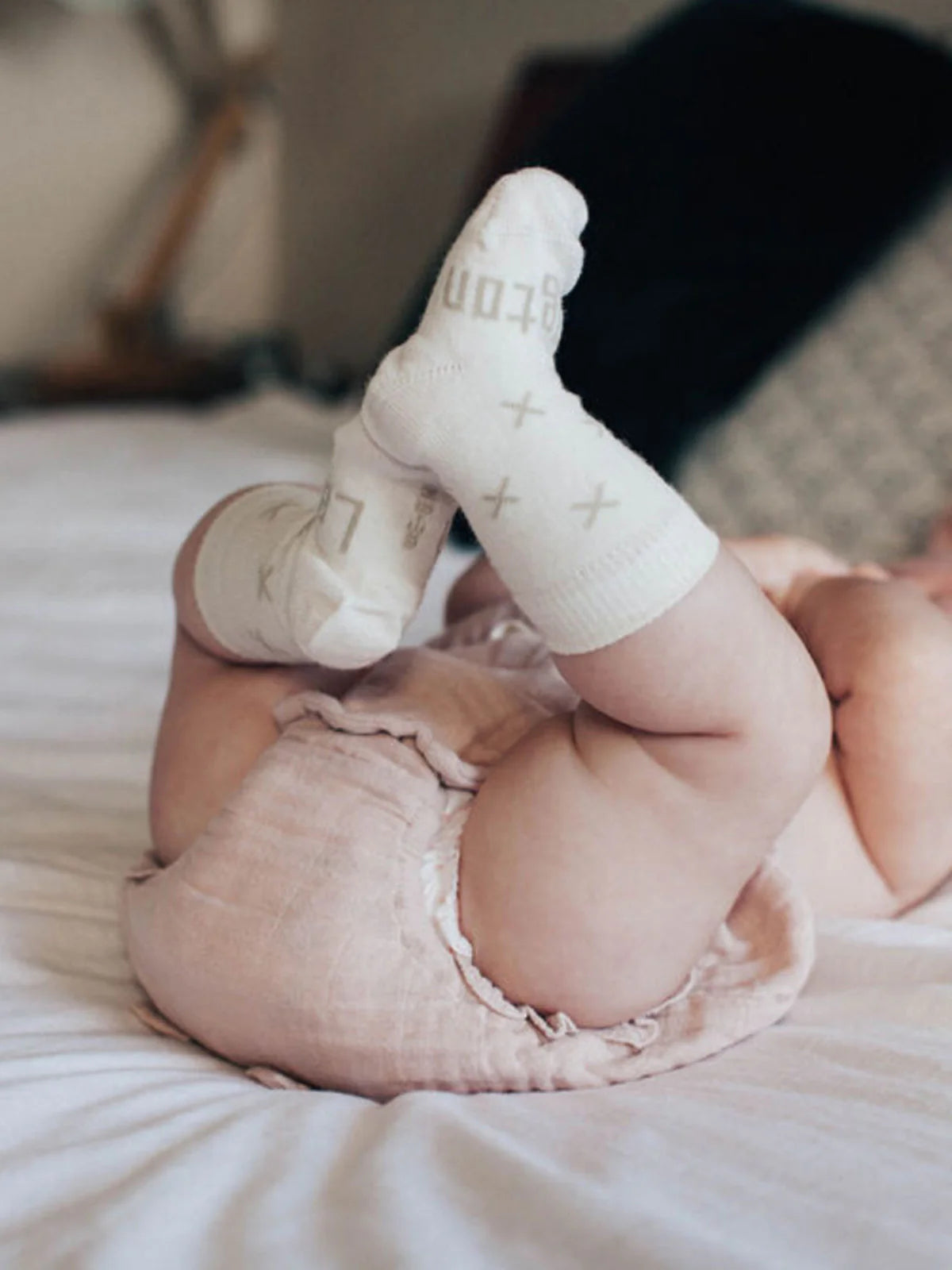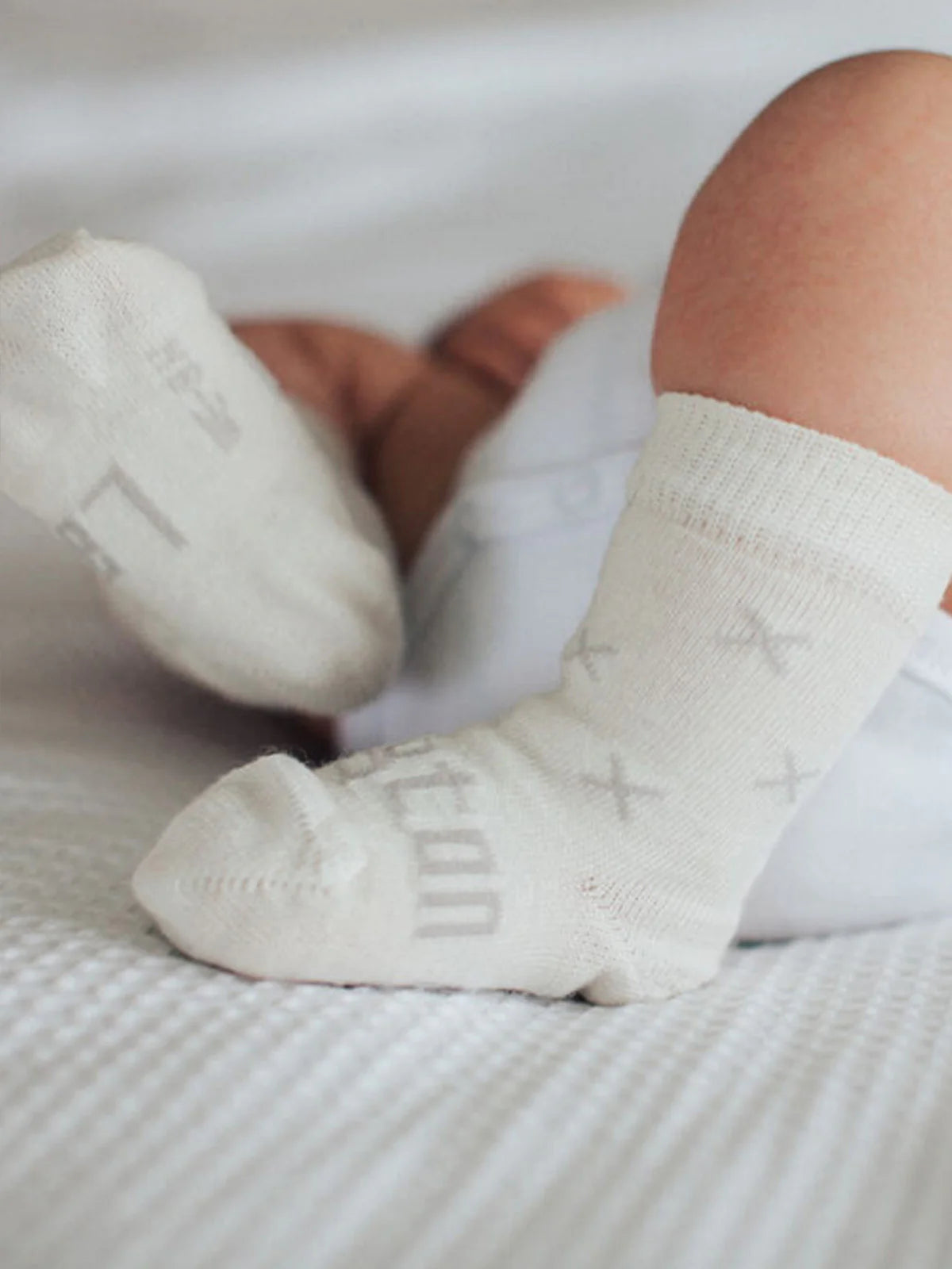 NEWBORN NATURAL - Fox - Natural with grey crosses crew length merino socks (*0-3m grey is a bit darker than in photo's)