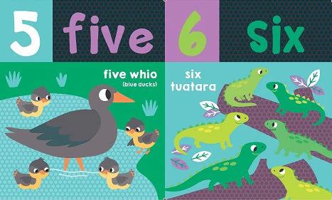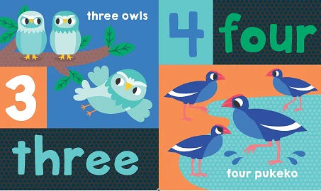Help your baby learn Numbers 1-10 in this chunky first counting board book featuring lots of kiwi animals such as pukeko, tuatara, tui and of course blue ducks. A bright and colourful first toddler board book that the young and parents will enjoy sharing together