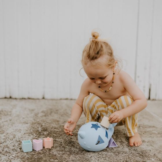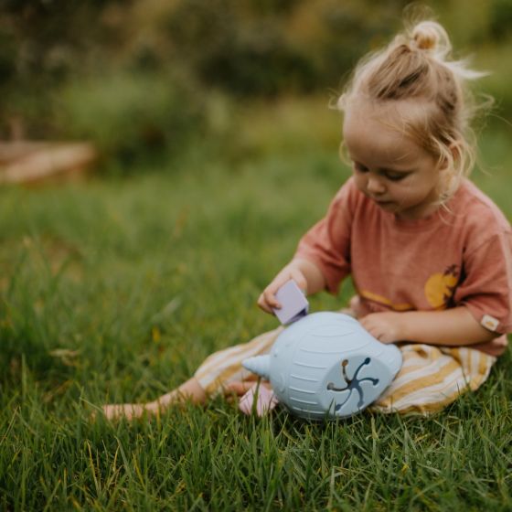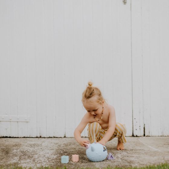 Our magical narwhal is ready to play. Bubs and toddlers can discover shapes and develop fine motor skills as they sort each piece through the corresponding openings. With our specially designed base, the blocks hold within the narwhal but can be easily accessed when it is time to play again.