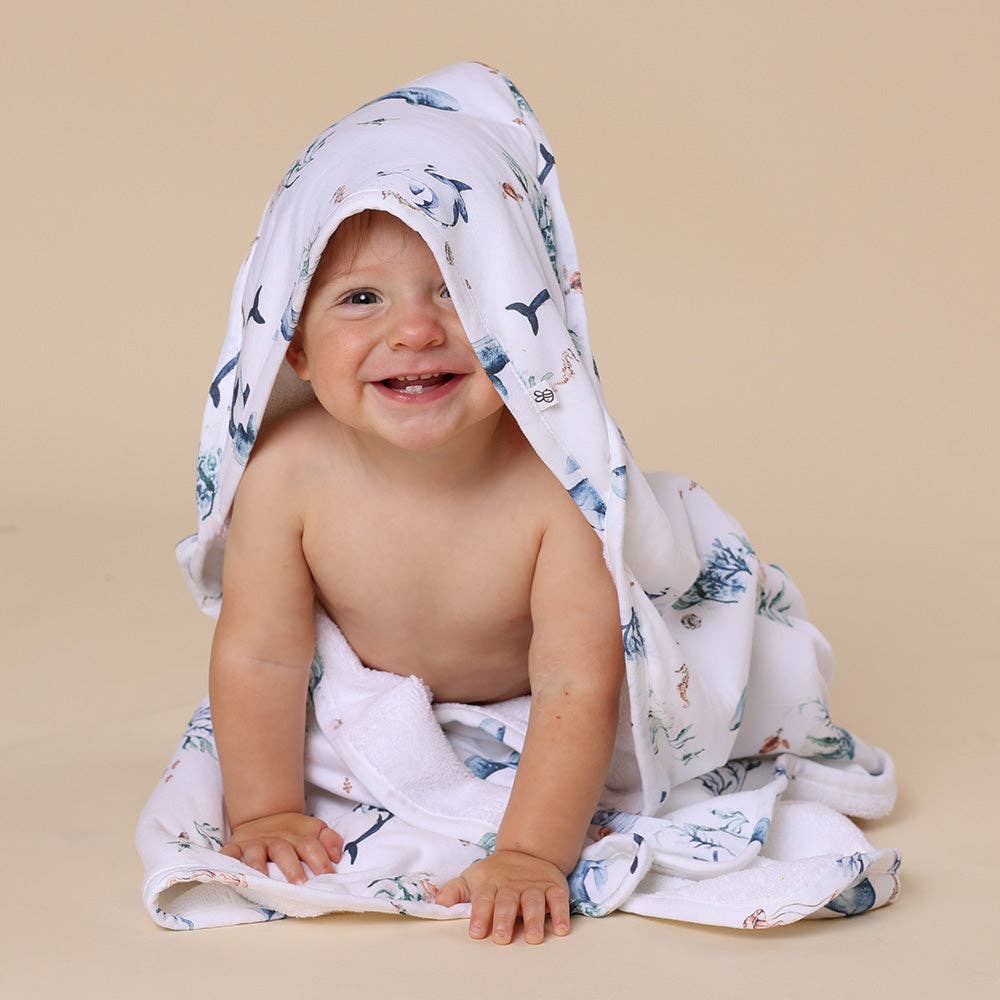 This beautiful extra large organic baby towel in Ocean is the perfect size for babies and toddlers and will brighten up any bathroom.