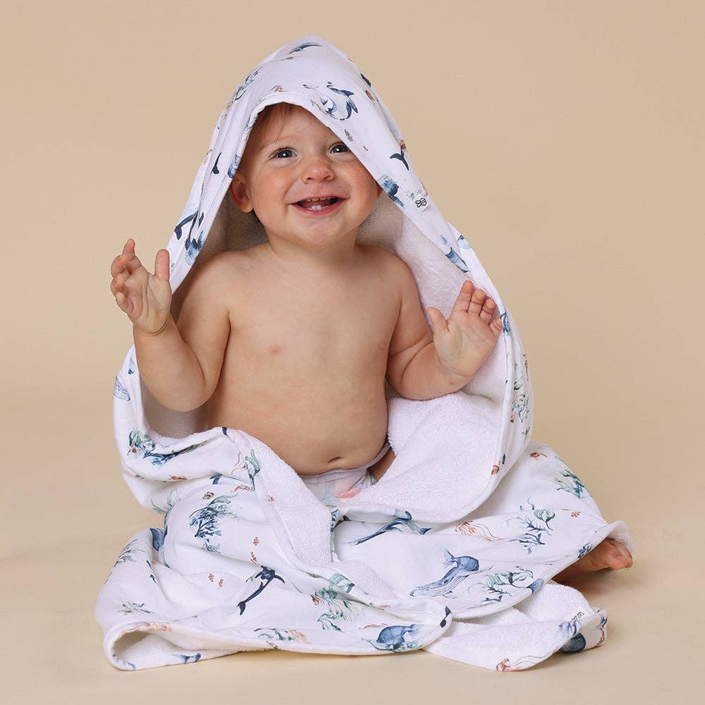 We have designed these unique towels with jersey organic cotton on one side and organic terry towelling on the other side. The jersey side features our exclusive Snuggle Hunny Ocean print. The towel is an extra large 90cm x 90cm so ideal for babies through to toddlers.
