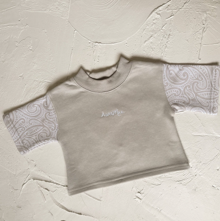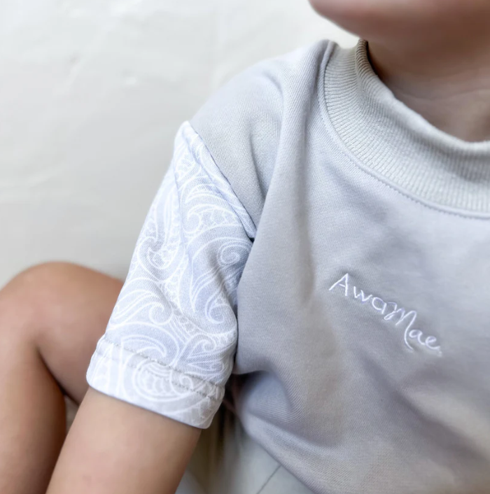 The wolf spring boxy tee in colour way Dove. Featuring a oversized boxy fit, our original wolf design printed on the sleeves, AwaMae embroidery, and a thick neckline, an everyday staple for the spring months