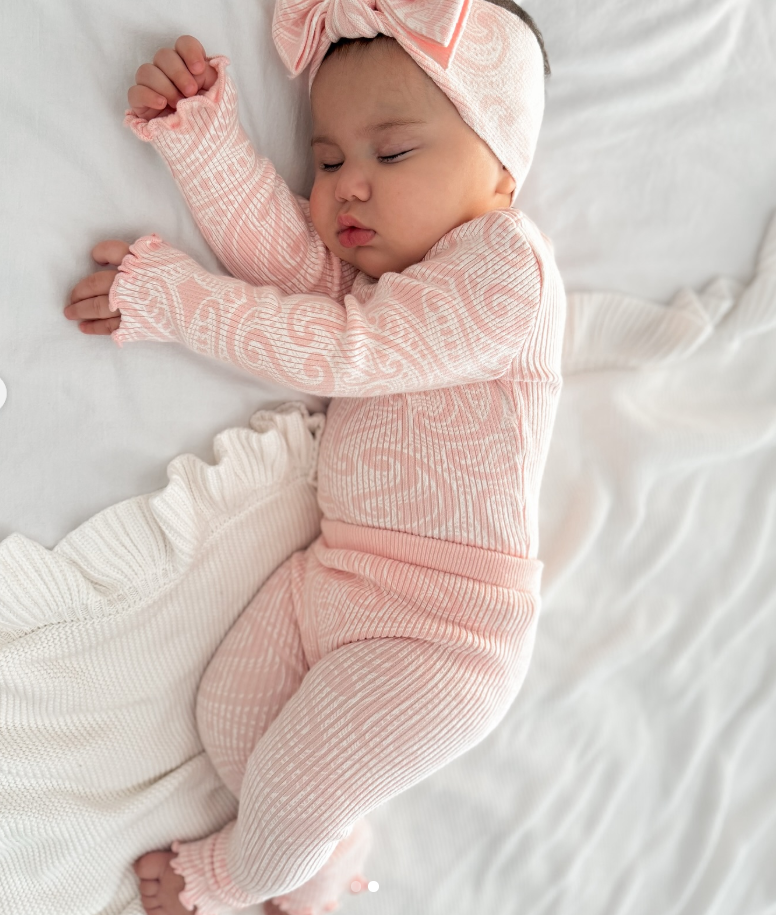 The AwaMae Knitted ribbed basics leggings- printed in our original wolf design in a baby pretty pink colour way (Ballerina).