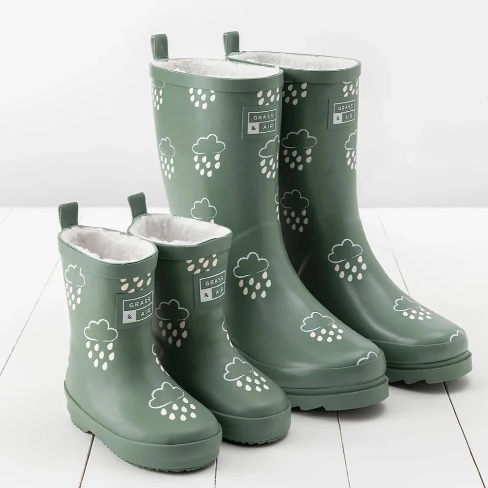 This trendy Khaki Green is great for any nature-loving fan bringing earthy hues and comfort. These knee-high boots feature our signature colour-changing technology, just like our kids' wellies. A simple splash of water transforms the white cloud print into colour! Plus, they're lined with fleece for extra warmth and come with a complimentary Grass & Air tote bag.
