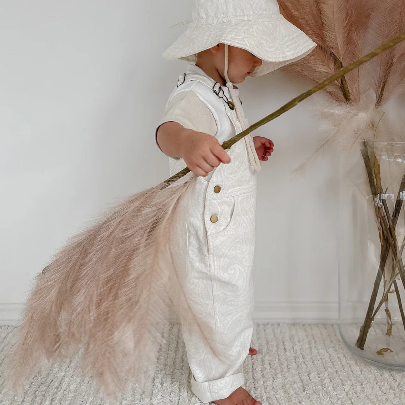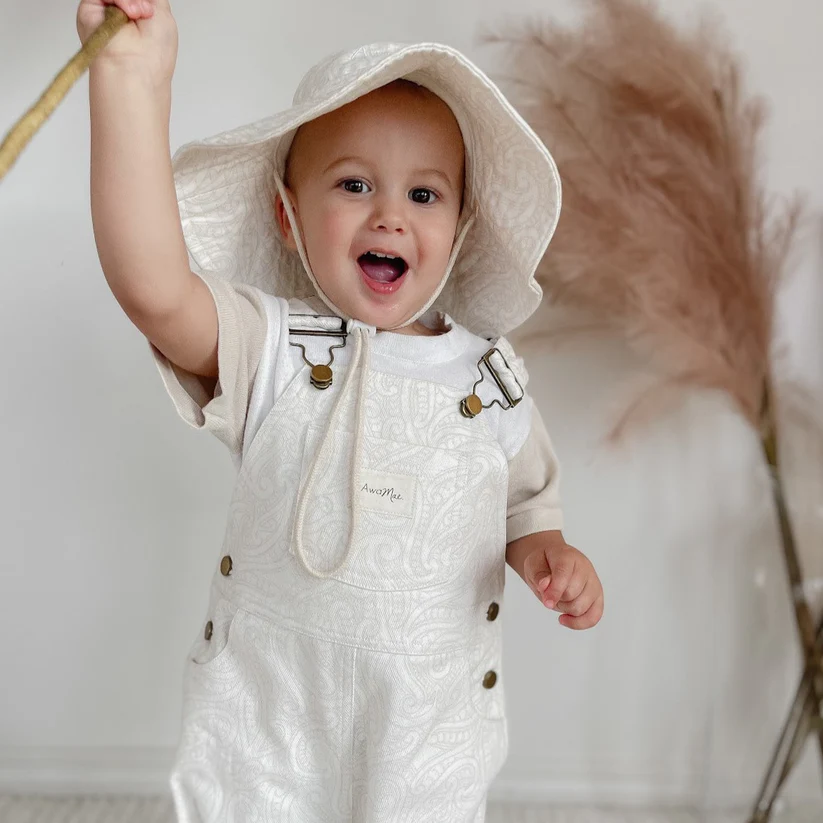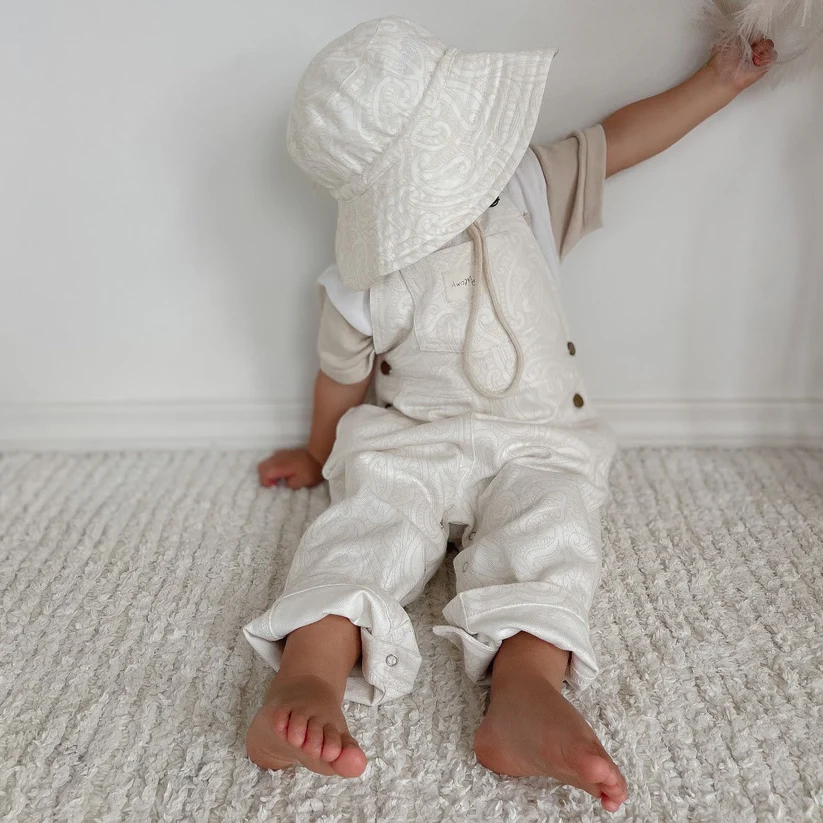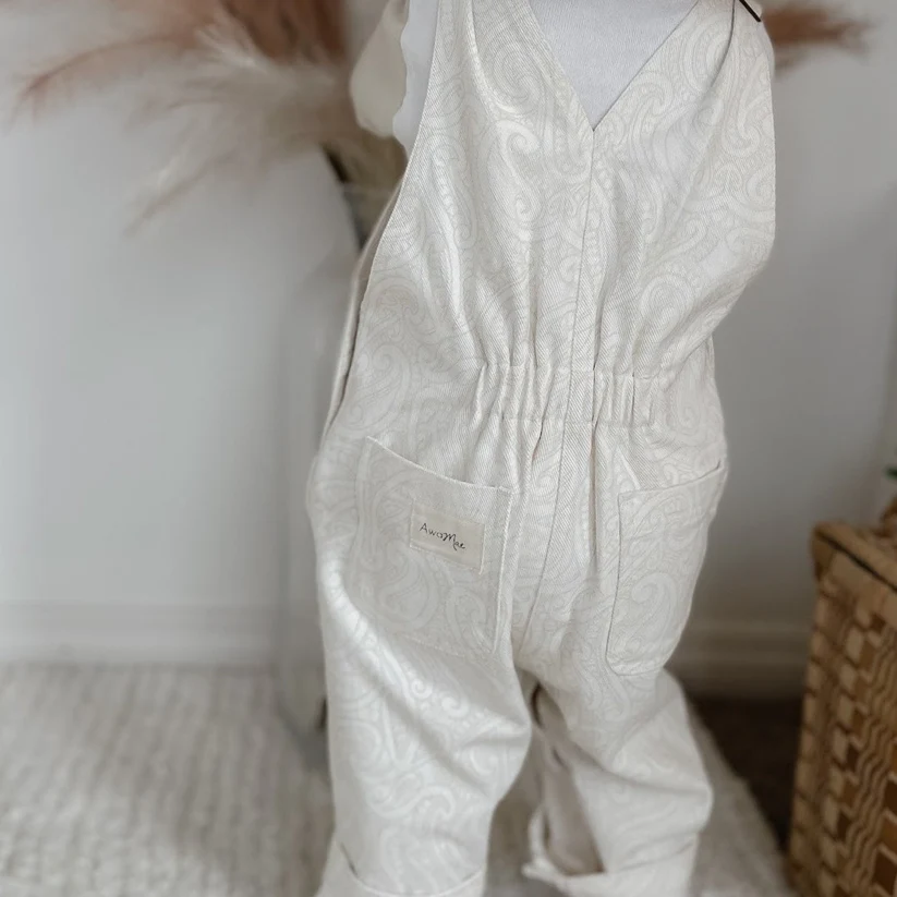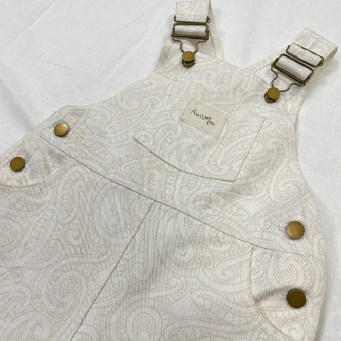 100% cotton twill overalls covered in our original design ‘the wolf’ in a muted light beige print. Featuring adjustable straps for longer wear, elasticated back, side buttons and snaps in the crutch for ages 0-2.